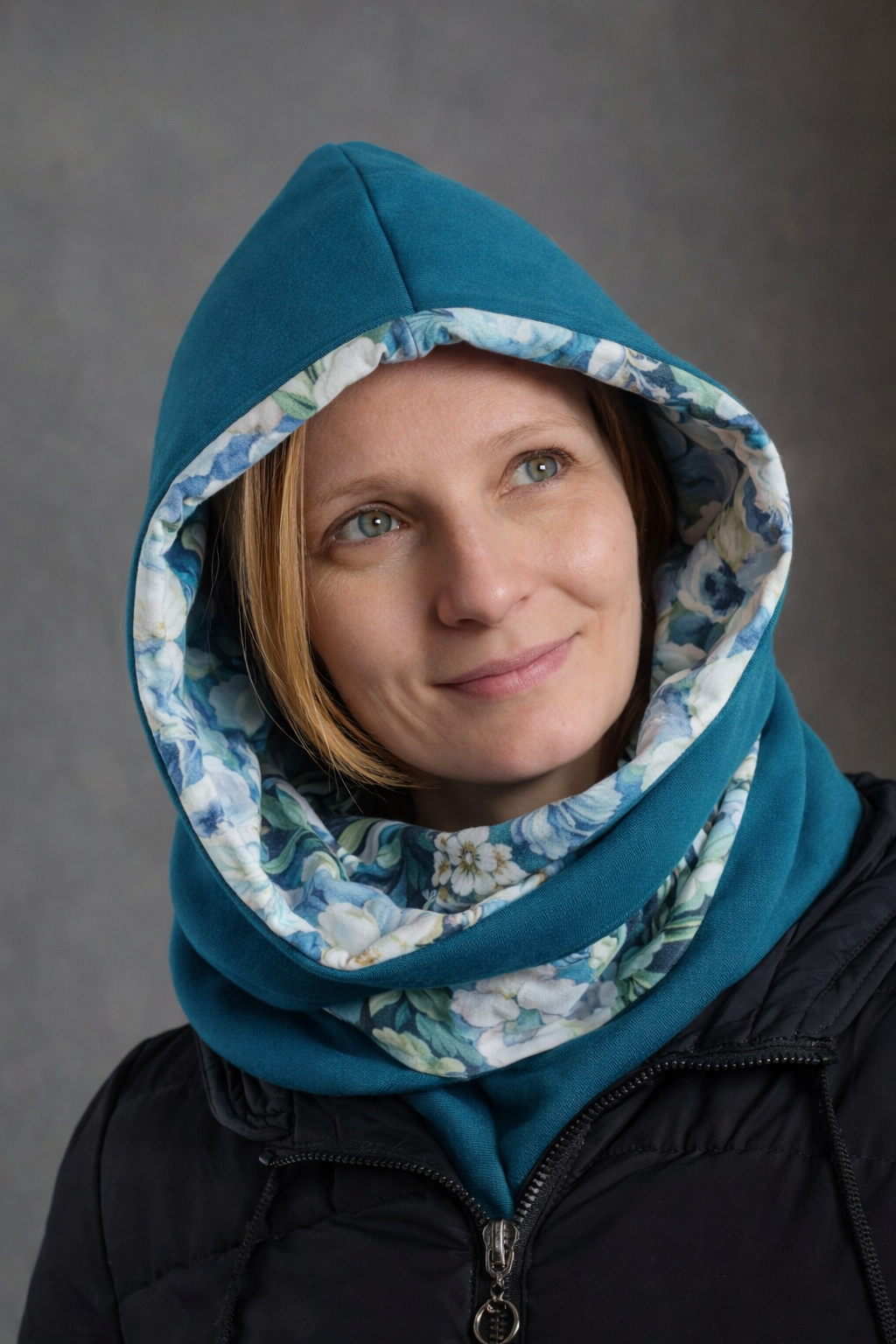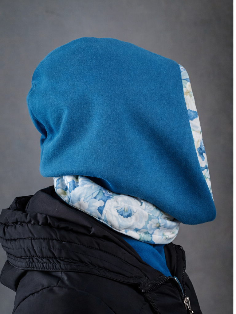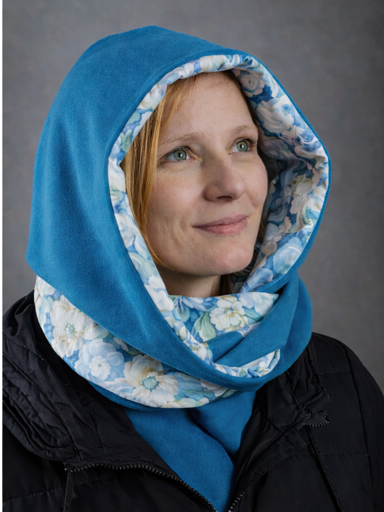 Dwustronna konstrukcja pozwala na różne sposoby noszenia – w bardziej stonowanej wersji lub z widocznym wzorem, w zależności od stylizacji i nastroju. Odpowiednia długość szalika umożliwia solidne otulenie szyi i sprawia, że kapturoszalik świetnie prezentuje się zarówno na kurtce, jak i na płaszczu.