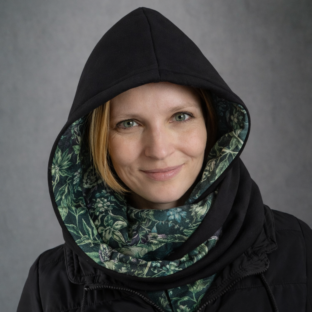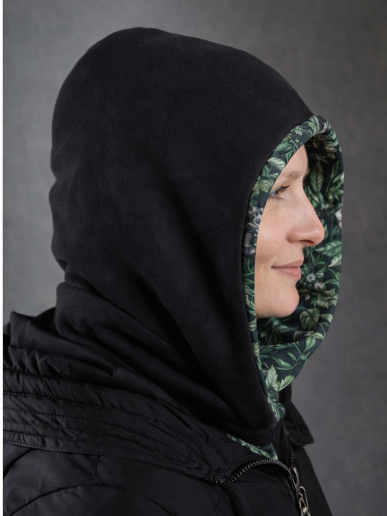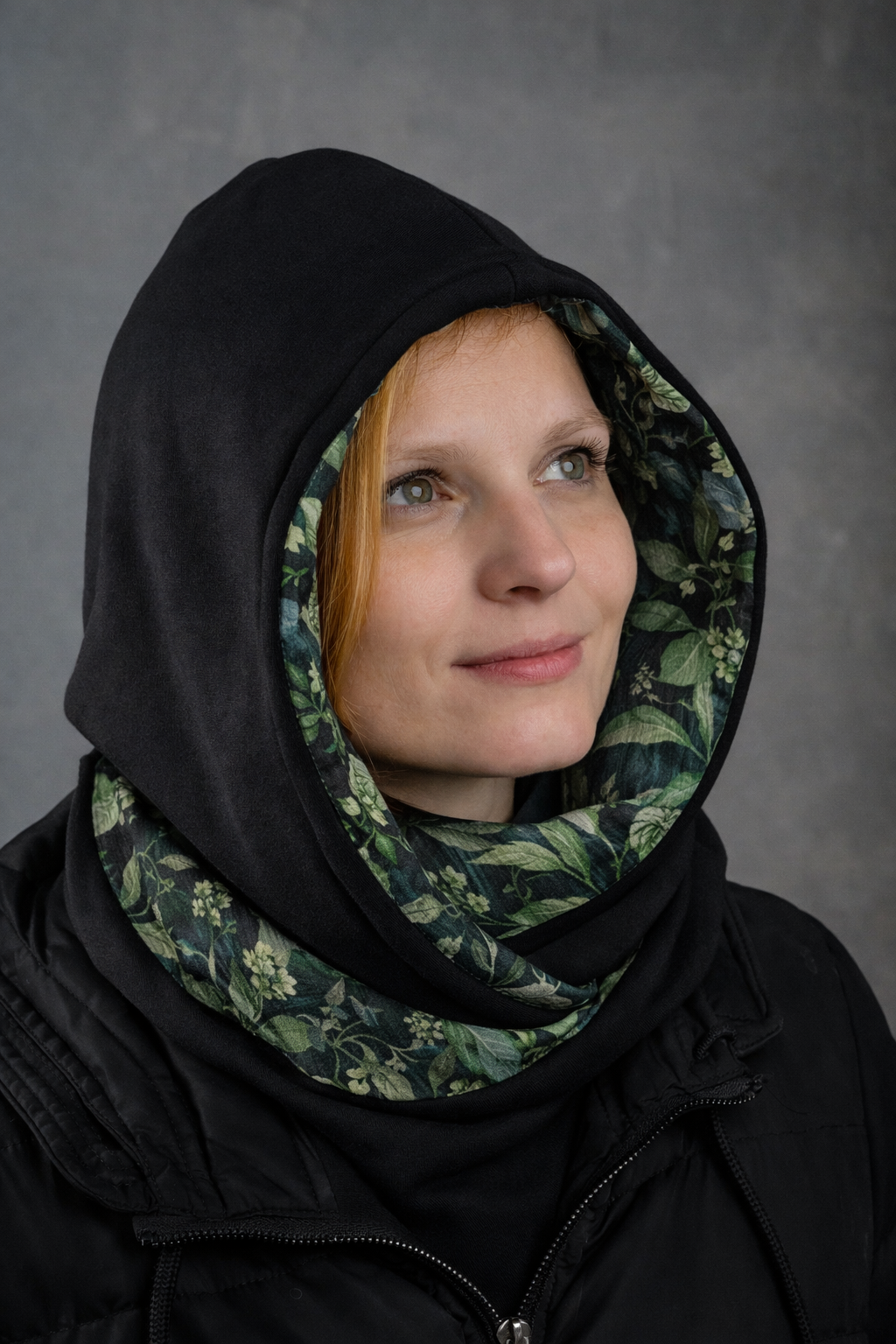 Kapturoszalik w klasycznym, głębokim czarnym kolorze to elegancki i uniwersalny dodatek, który doskonale łączy ponadczasową prostotę z wyrazistym, naturalnym akcentem. Czerń zewnętrznej dzianiny tworzy idealne tło dla wewnętrznego, botanicznego wzoru inspirowanego leśną roślinnością, nadając całości charakteru i subtelnej tajemniczości.