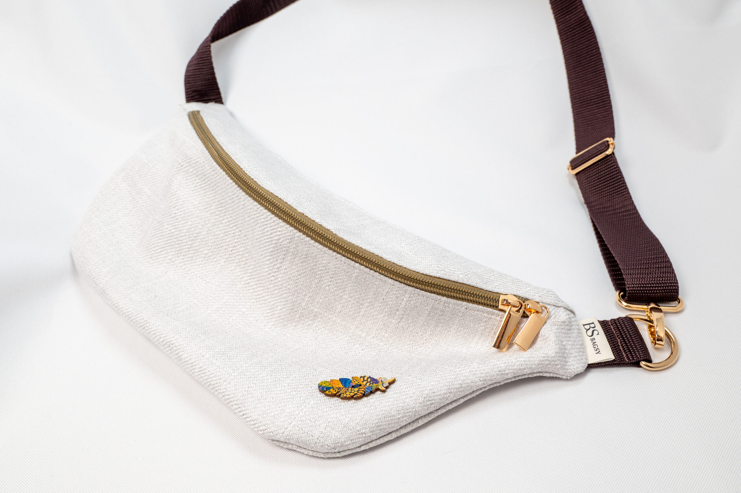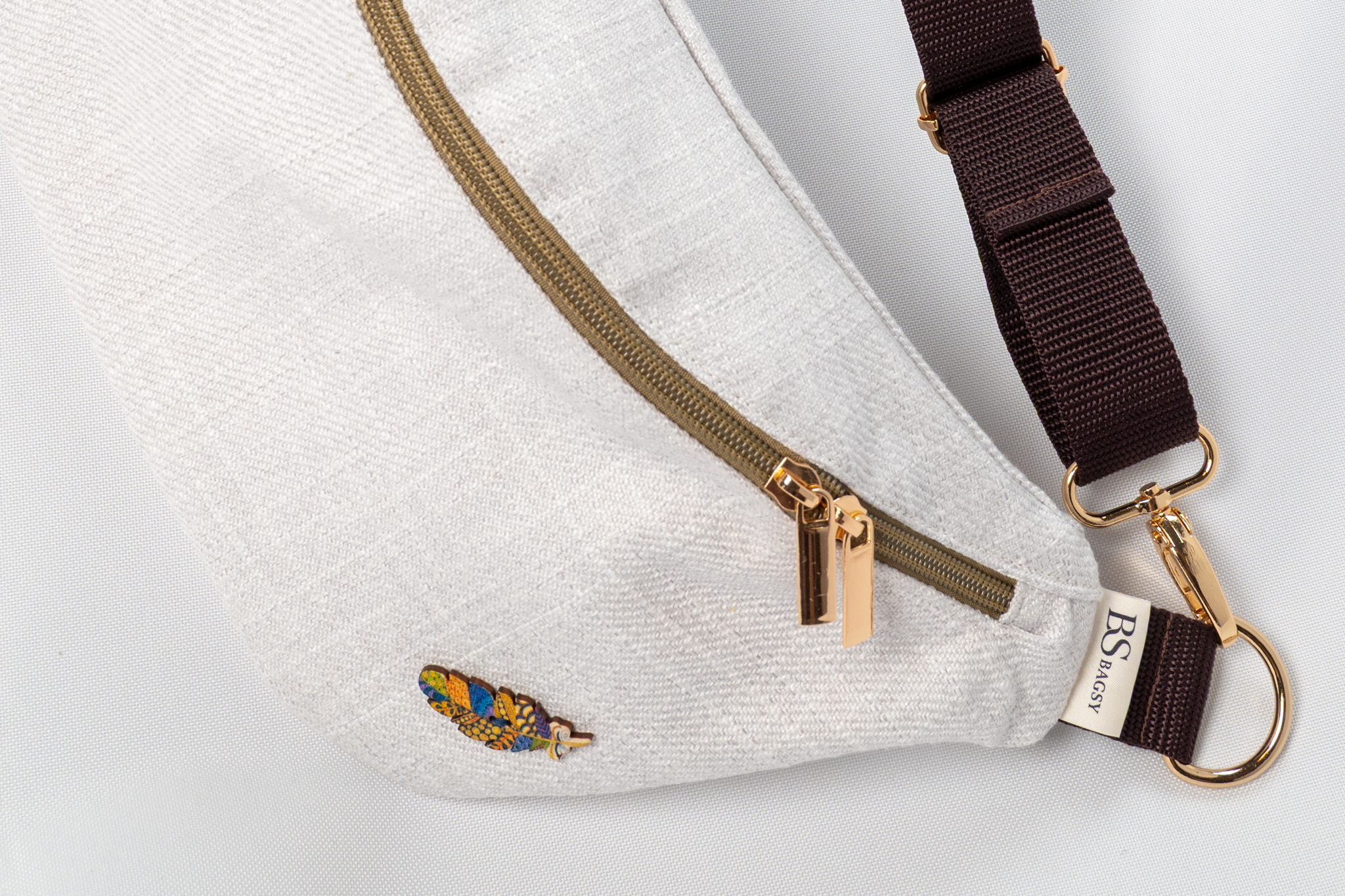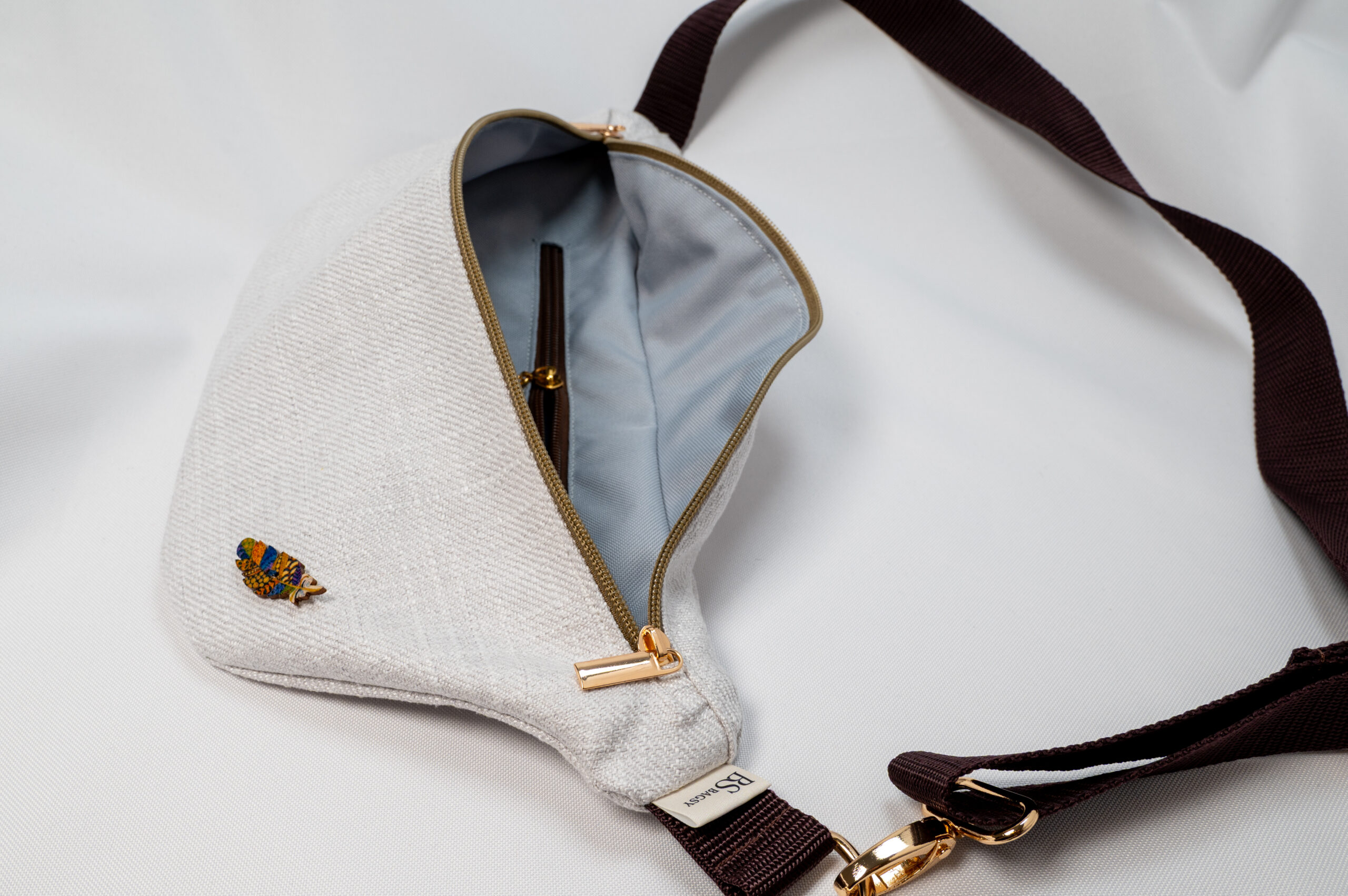 Ta nerka zachwyca swoją subtelnością i uniwersalnością. Jasna tkanina w odcieniu kremowej bieli ma delikatny, elegancki splot, który dodaje jej klasy i ponadczasowego charakteru. Model prezentuje się wyjątkowo lekko i świeżo, a złoty zamek błyskawiczny wprowadza luksusowy akcent, idealnie współgrający z brązowym paskiem i złotymi okuciami.