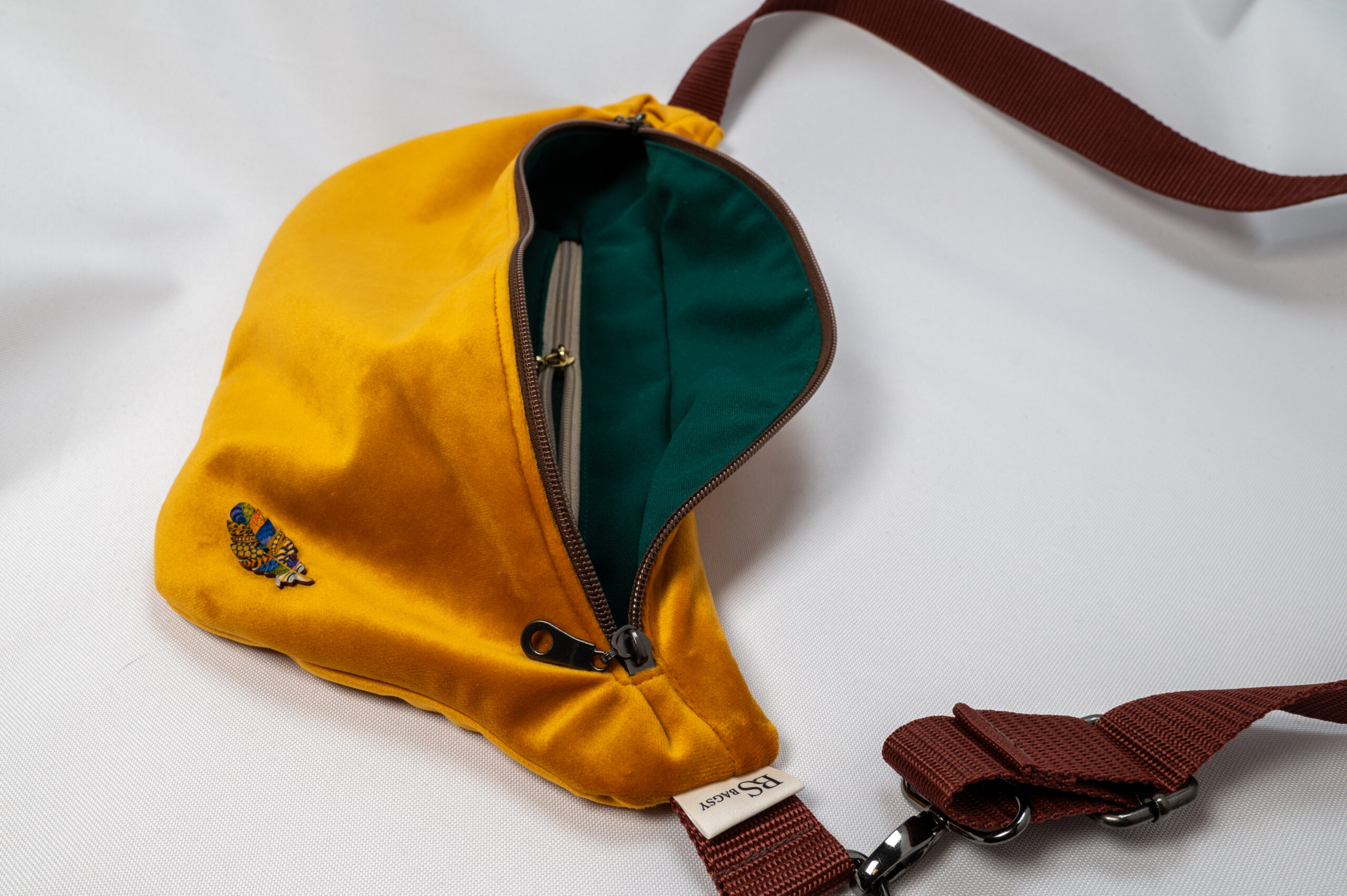 Ręcznie robiona nerka z miękkiego weluru – ciepła, miodowa barwa połączona z głębokim brązem tworzą ponadczasowy, kobiecy duet.