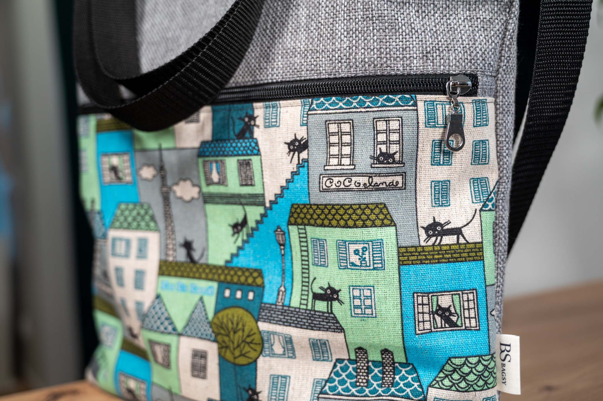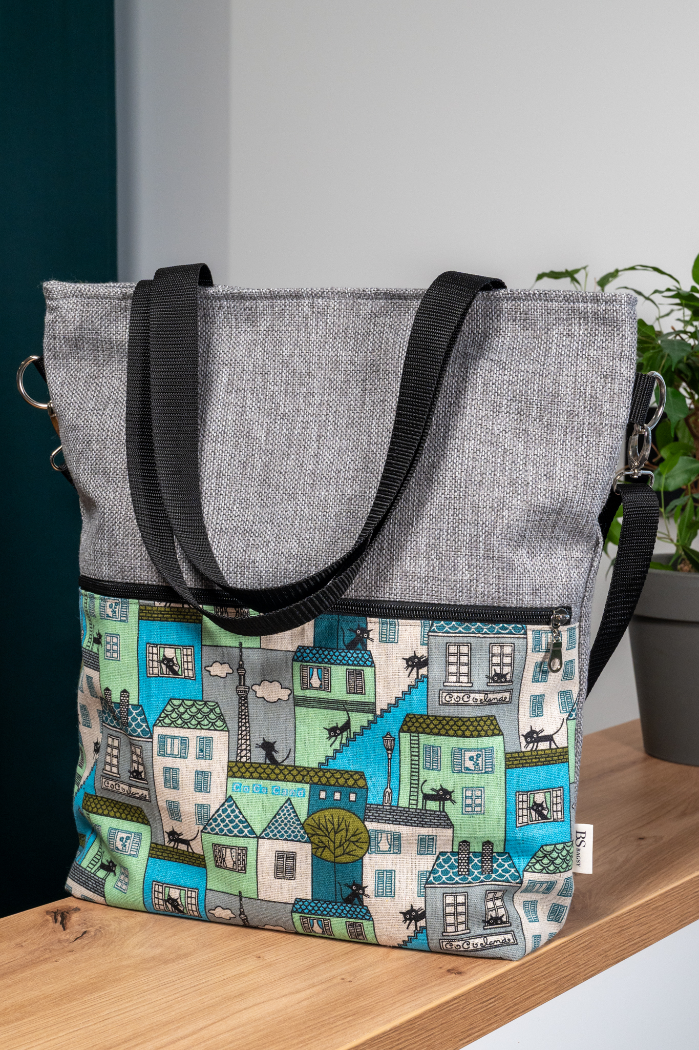 Torba została uszyta z grubych materiałów tapicerskich, które dobrze znoszą codzienne użytkowanie i pomagają utrzymać formę.