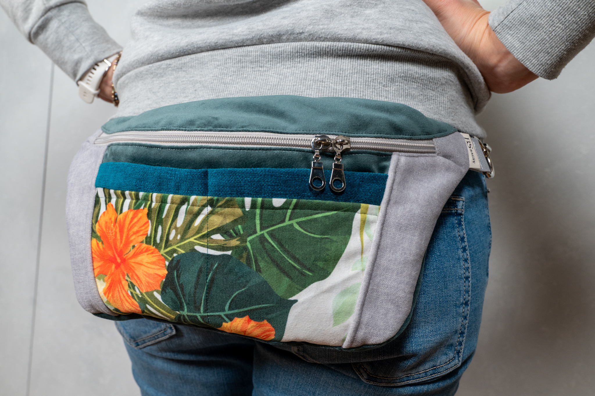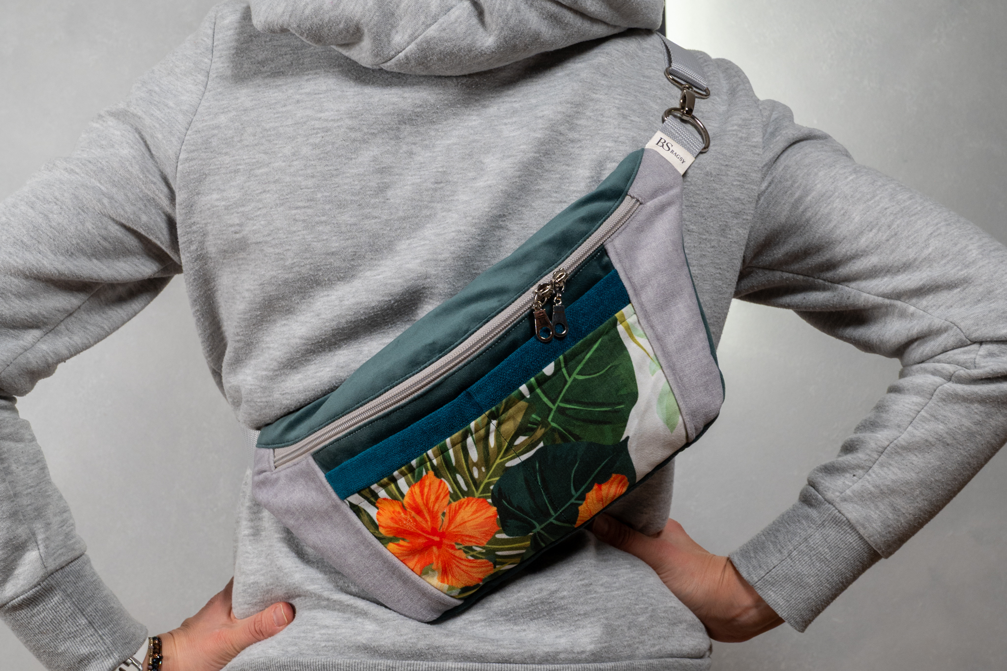 Połączenie stonowanych szarości, głębokiej zieleni i wyrazistego, tropikalnego wzoru z liśćmi oraz kwiatami tworzy unikatową, patchworkową kompozycję. To model, który przyciąga spojrzenia i nadaje stylizacji charakteru – bardziej jak dodatek modowy niż zwykła nerka.